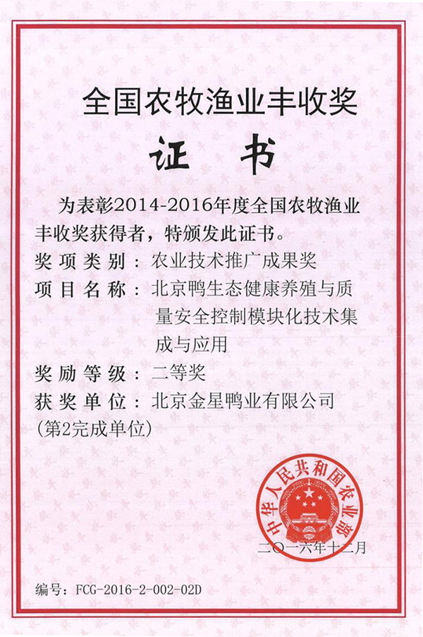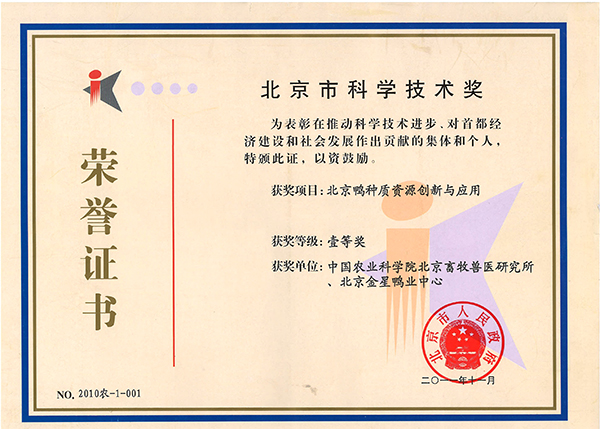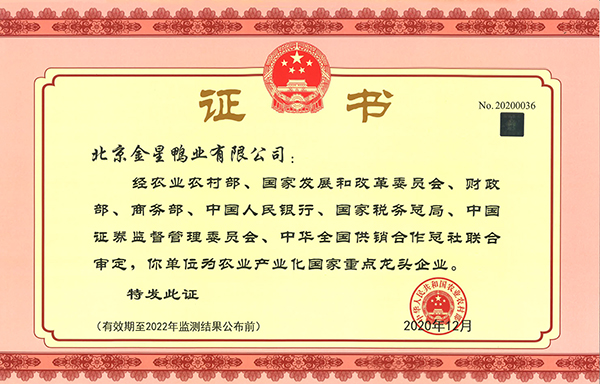 經(jīng)過二十余年的發(fā)展,北京金星鴨業(yè)有限公司的社會(huì)影響力愈來愈高,通過了ISO9001質(zhì)量管理體系、ISO22000食品安全管理體系、ISO14000環(huán)境體系等認(rèn)證,并獲得了北京市模范集體、國家科學(xué)技術(shù)進(jìn)步二等獎(jiǎng)、北京市科技進(jìn)步一等獎(jiǎng)、全國農(nóng)業(yè)標(biāo)準(zhǔn)化示范農(nóng)場(chǎng)、北京市農(nóng)業(yè)產(chǎn)業(yè)化重點(diǎn)龍頭企業(yè)、農(nóng)業(yè)產(chǎn)業(yè)化國家重點(diǎn)龍頭企業(yè)、國家高新技術(shù)企業(yè)、北京鴨地理標(biāo)志產(chǎn)品首家授權(quán)使用單位等多項(xiàng)榮譽(yù)。